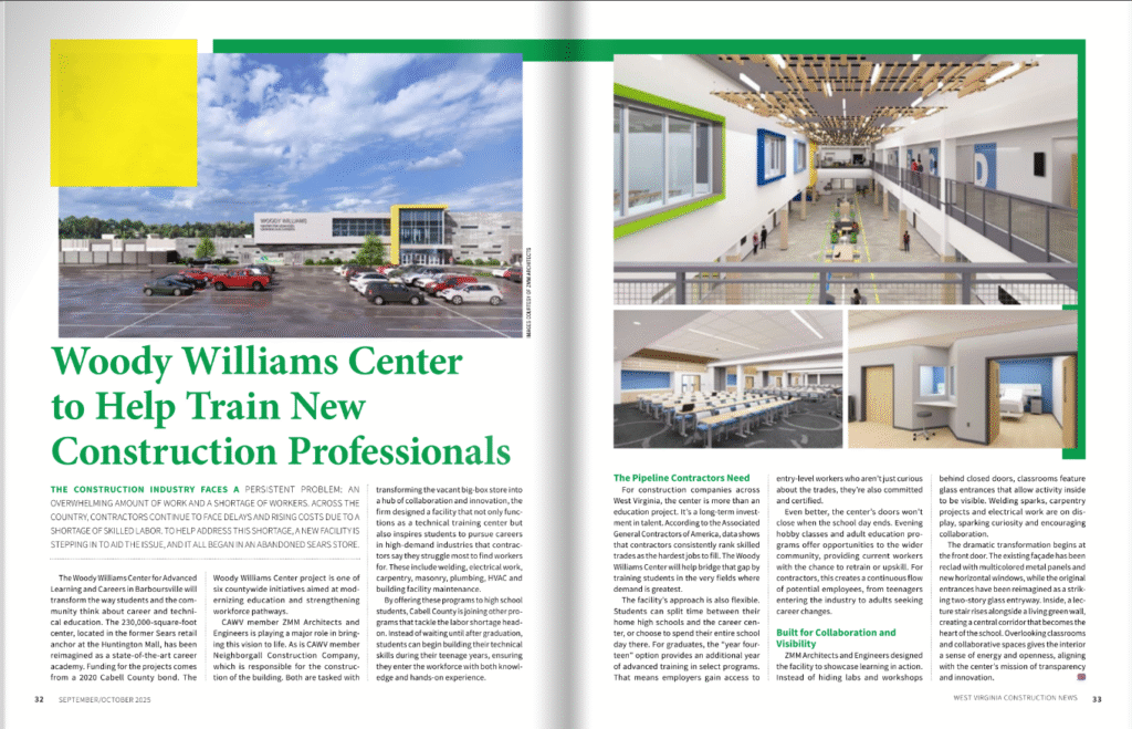 The Woody Williams Center for Advanced Learning and Careers, an adaptive reuse project to convert a former large retail store at the Barboursville Mall into a state-of-the-art career and technical center for Cabell County Schools, was featured in the September/October 2025 issue of West Virginia Construction News. Read the full story in the digital edition.