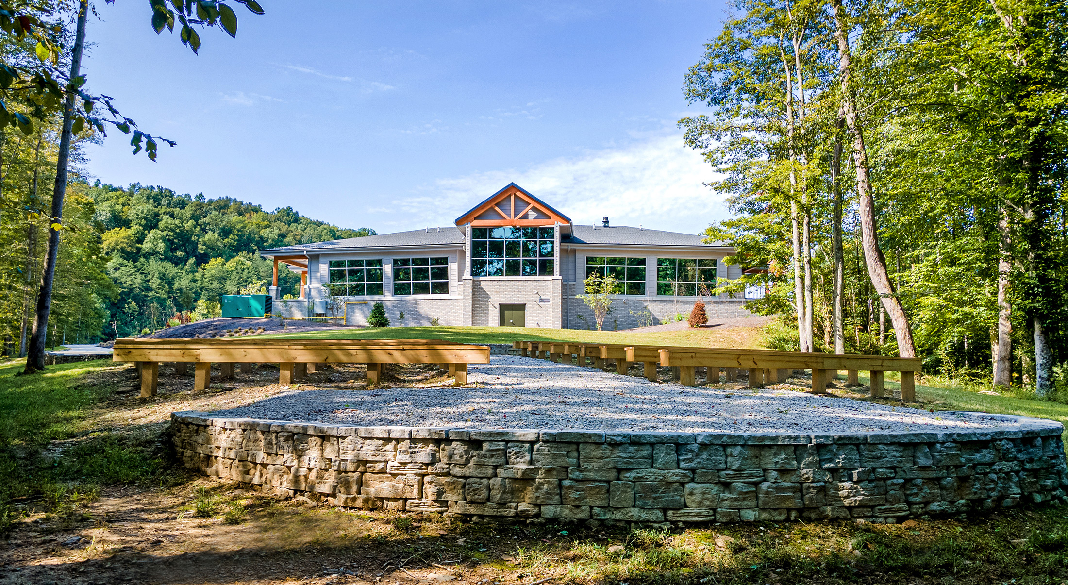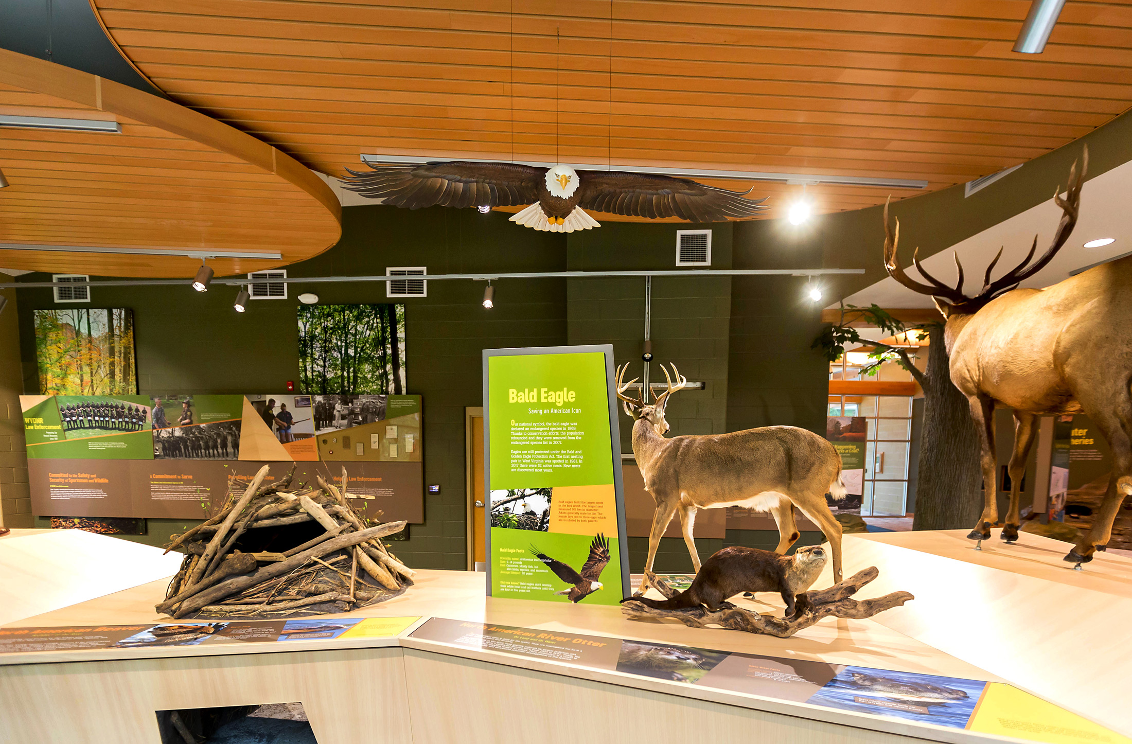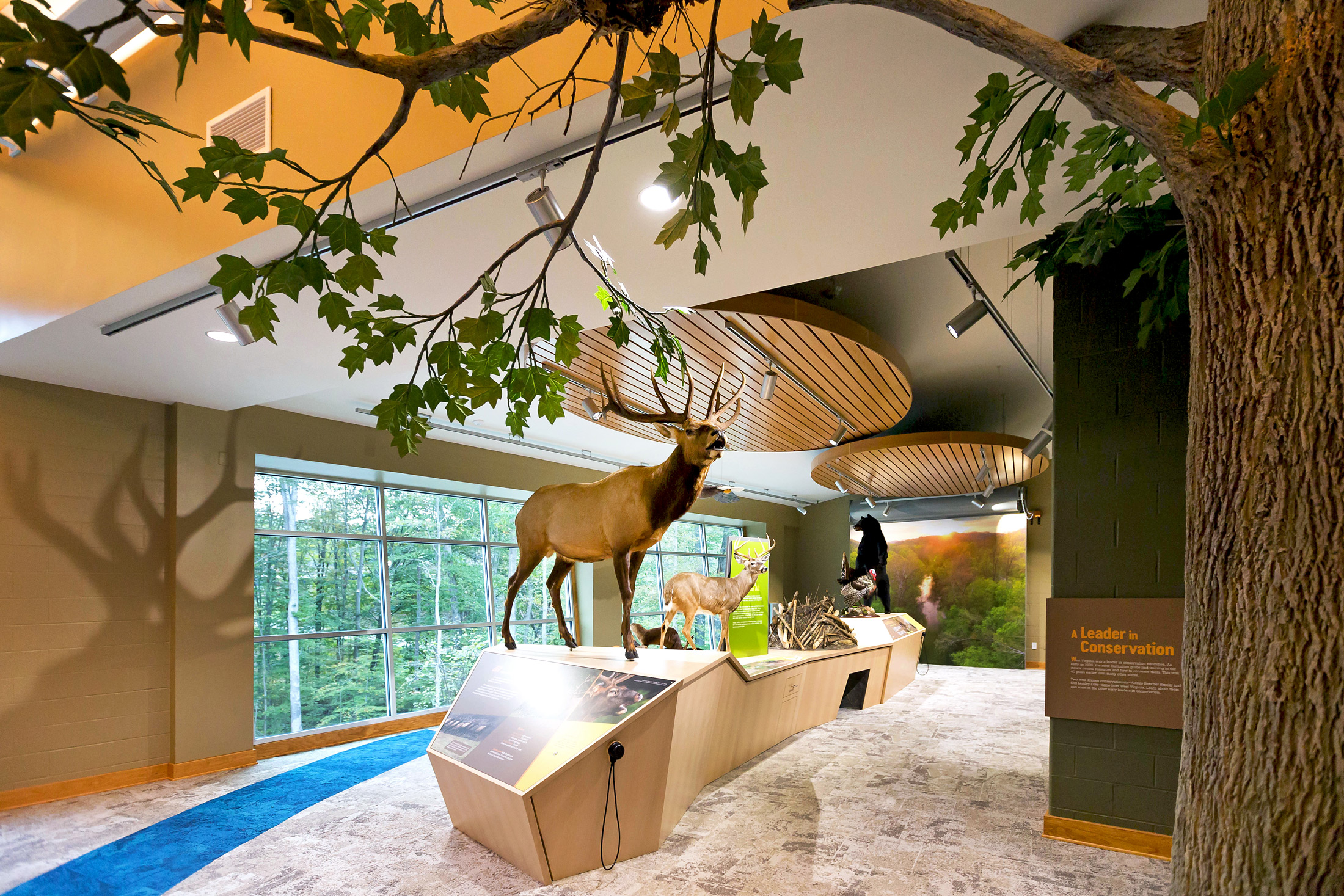 The facility is a 7,000 SF building nestled in the beautiful West Virginia landscape. The building layout concentrates on both the visitor and user experience, while creating a dynamic space to celebrate some of West Virginia’s greatest natural treasures. One of the key concepts of the building is to represent our wild and wonderful state by incorporating natural materials such as stone, a variety of woods, and other natural finishes.