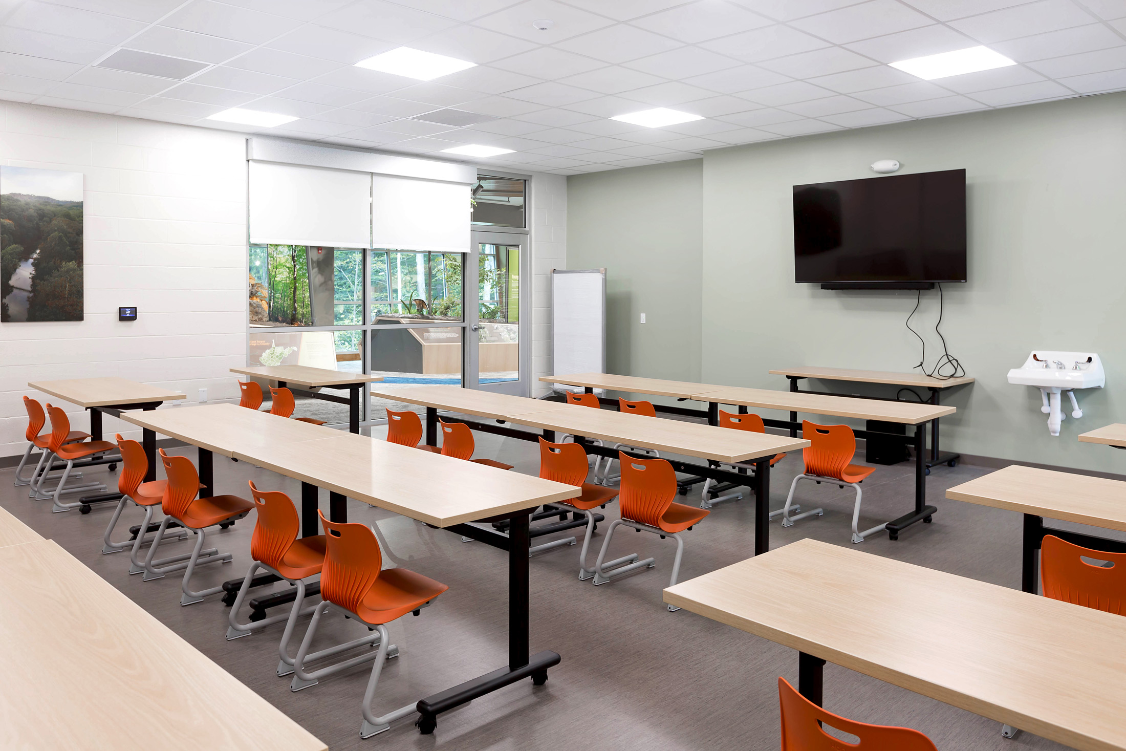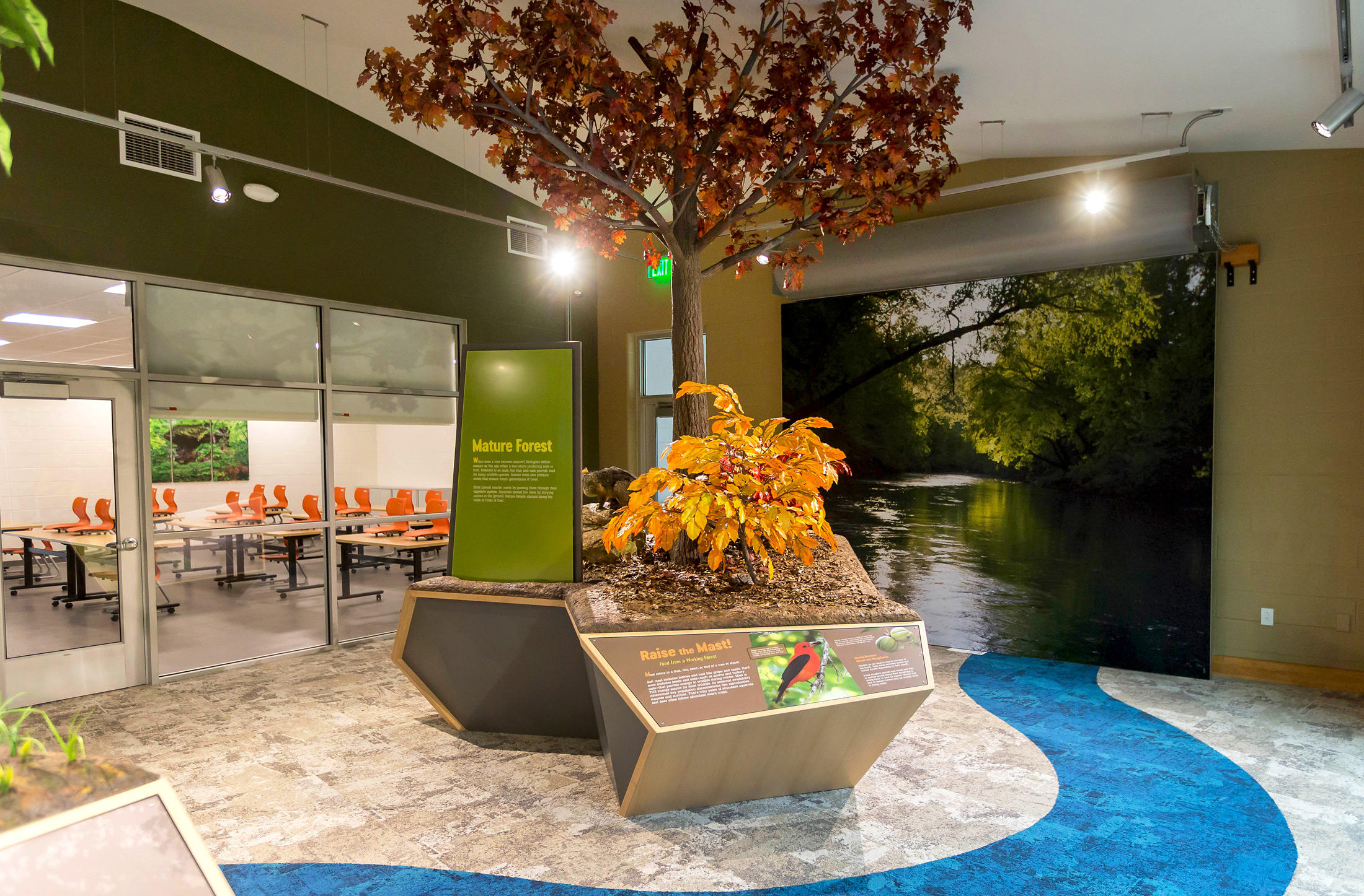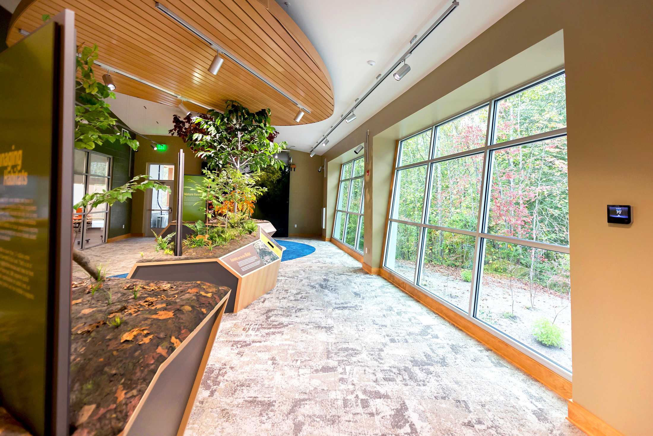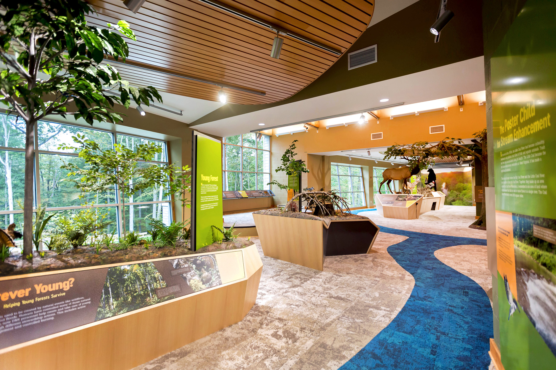The entire eastern half of the building is devoted to exhibit space. The layout allows one large expansive space, or multiple smaller spaces, to allow visitors to interact within one space, while creating the opportunity in another space for exhibits to be updated. The angled walls, placement of exterior glass, and door placement creates a naturally vibrant exhibit space, as the outdoors become part of the exhibit experience, as a large, elevated deck spans across the landscape, creating the ultimate viewing platform for the breathtaking views of the Forks of Coal State Natural Area.