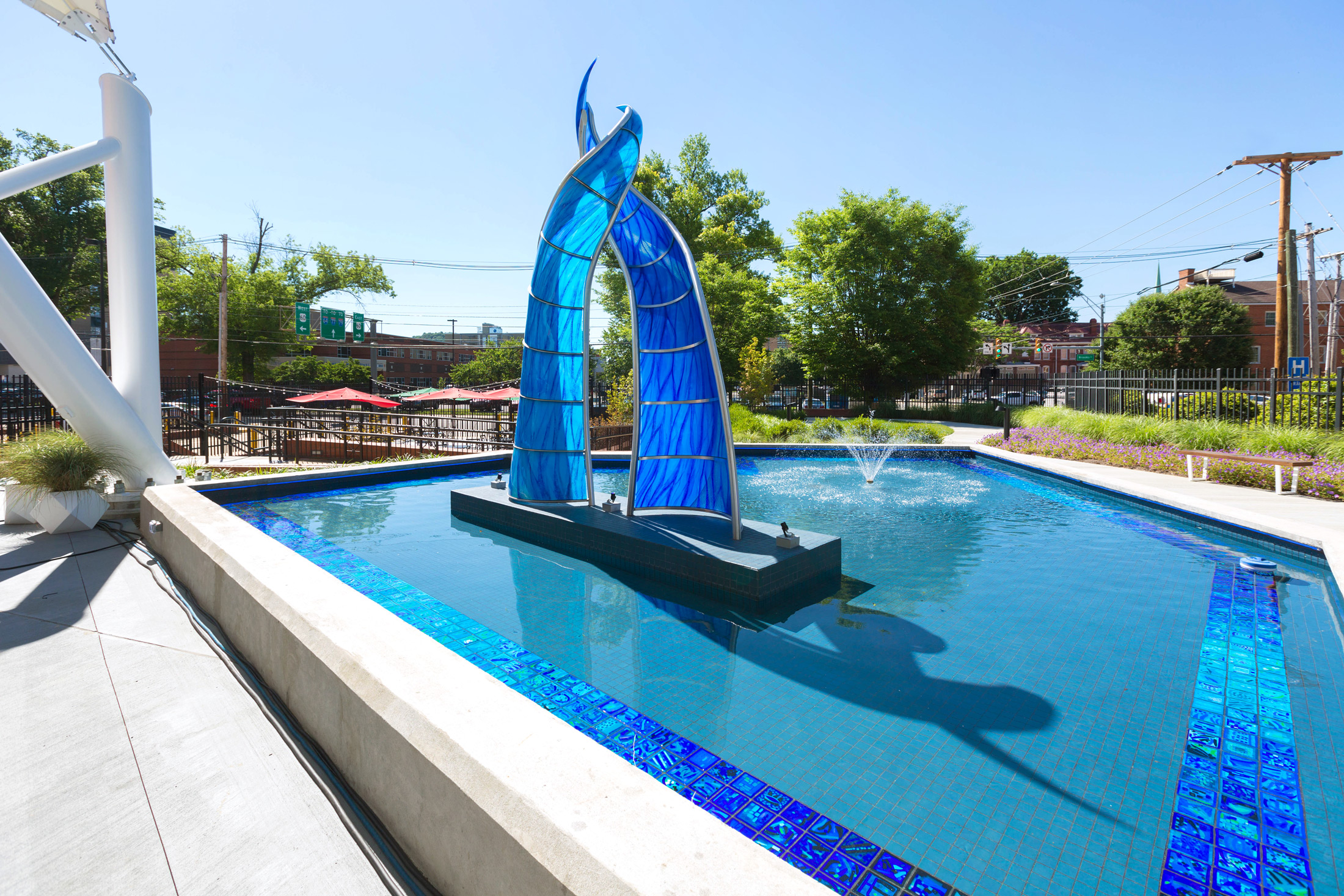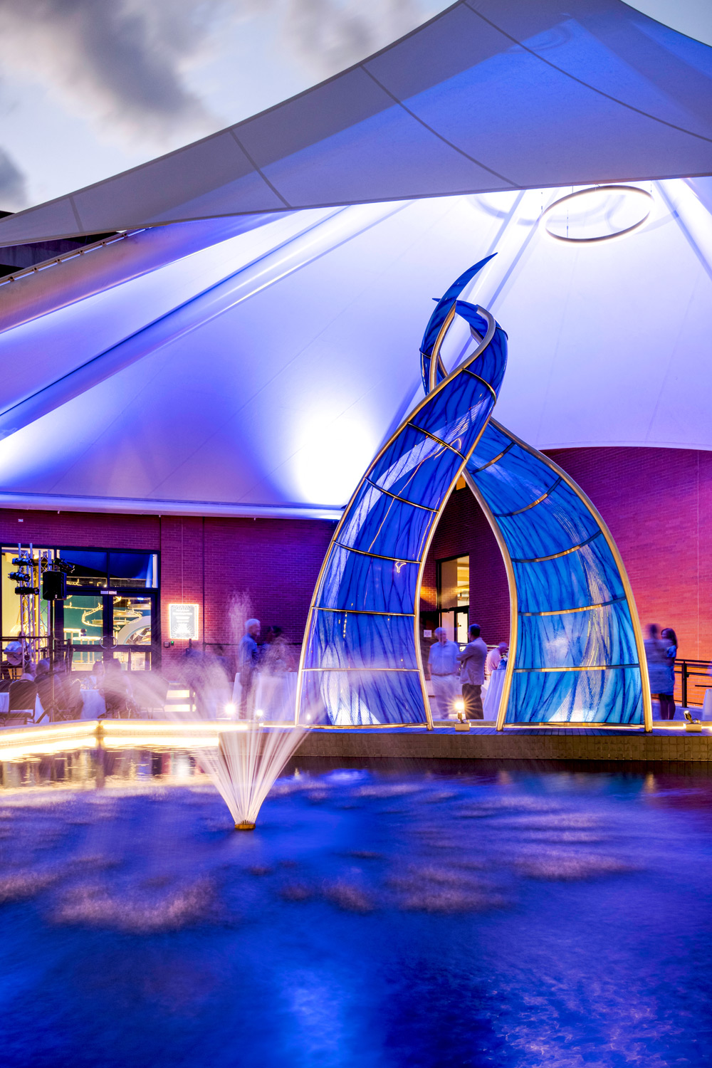 To create a place to listen, the design team developed a small event space covered with an artful tensile fabric canopy which is to be used for small outdoor concerts, weddings, and parties. For an area of reflection, the design team enhanced an existing landscape area with a large reflecting pool and fountain. At the center of the pool is the feature sculpture, which blends into the water below. Finally, for a space of interaction, the team enhanced an existing paved area by accenting it with new seating, lighting, and landscape materials. The new interaction space is envisioned to be used for dining, meetings, and outdoor classroom space.