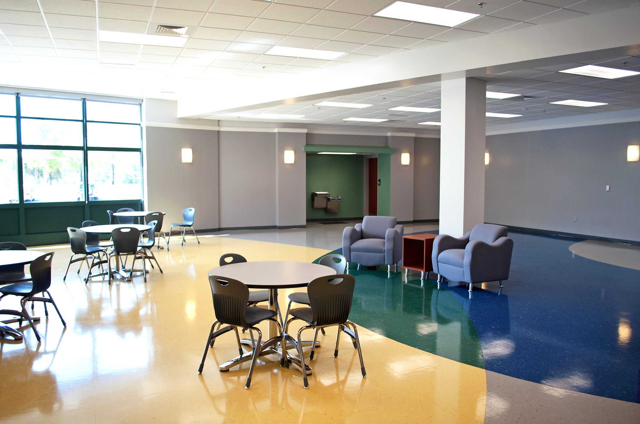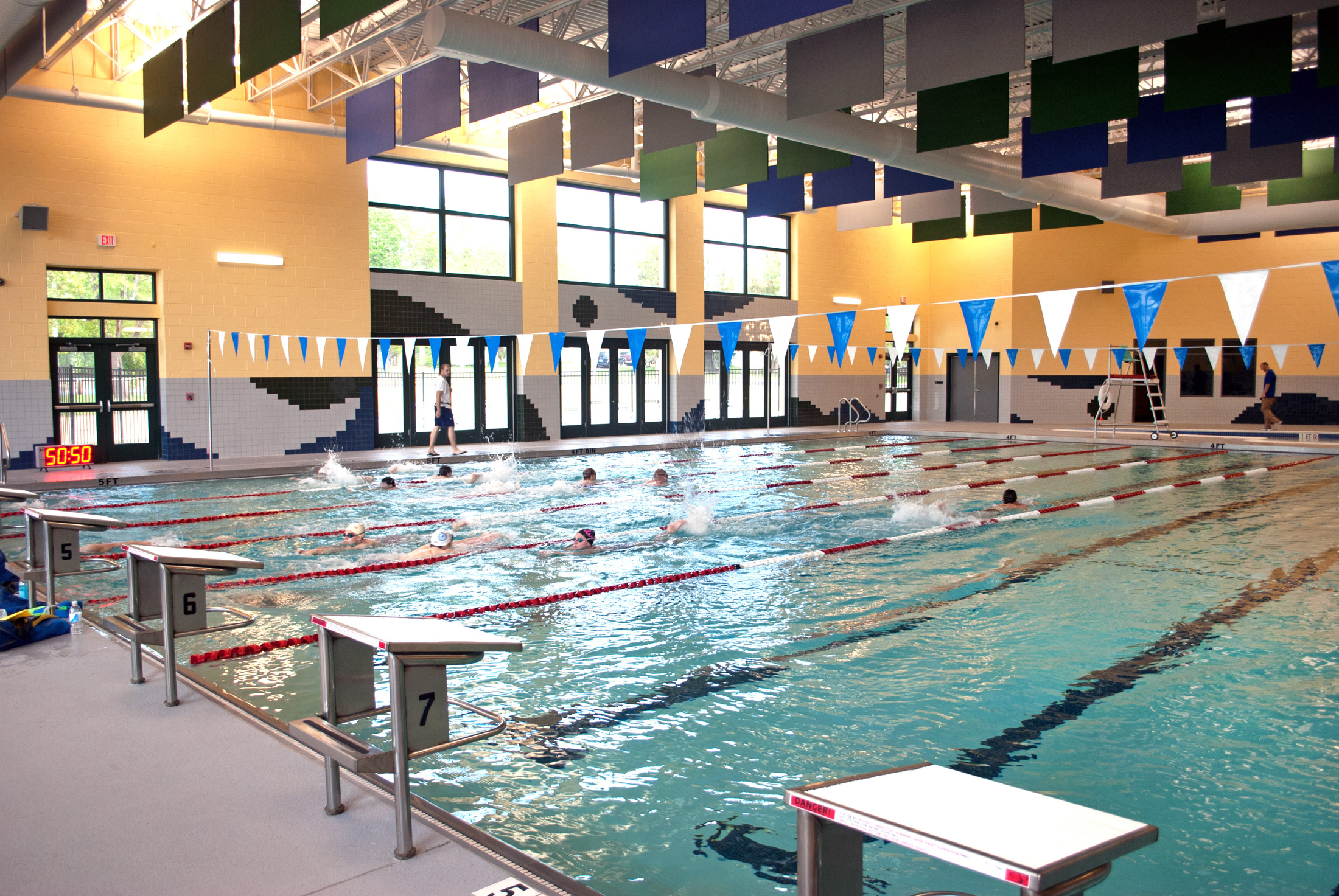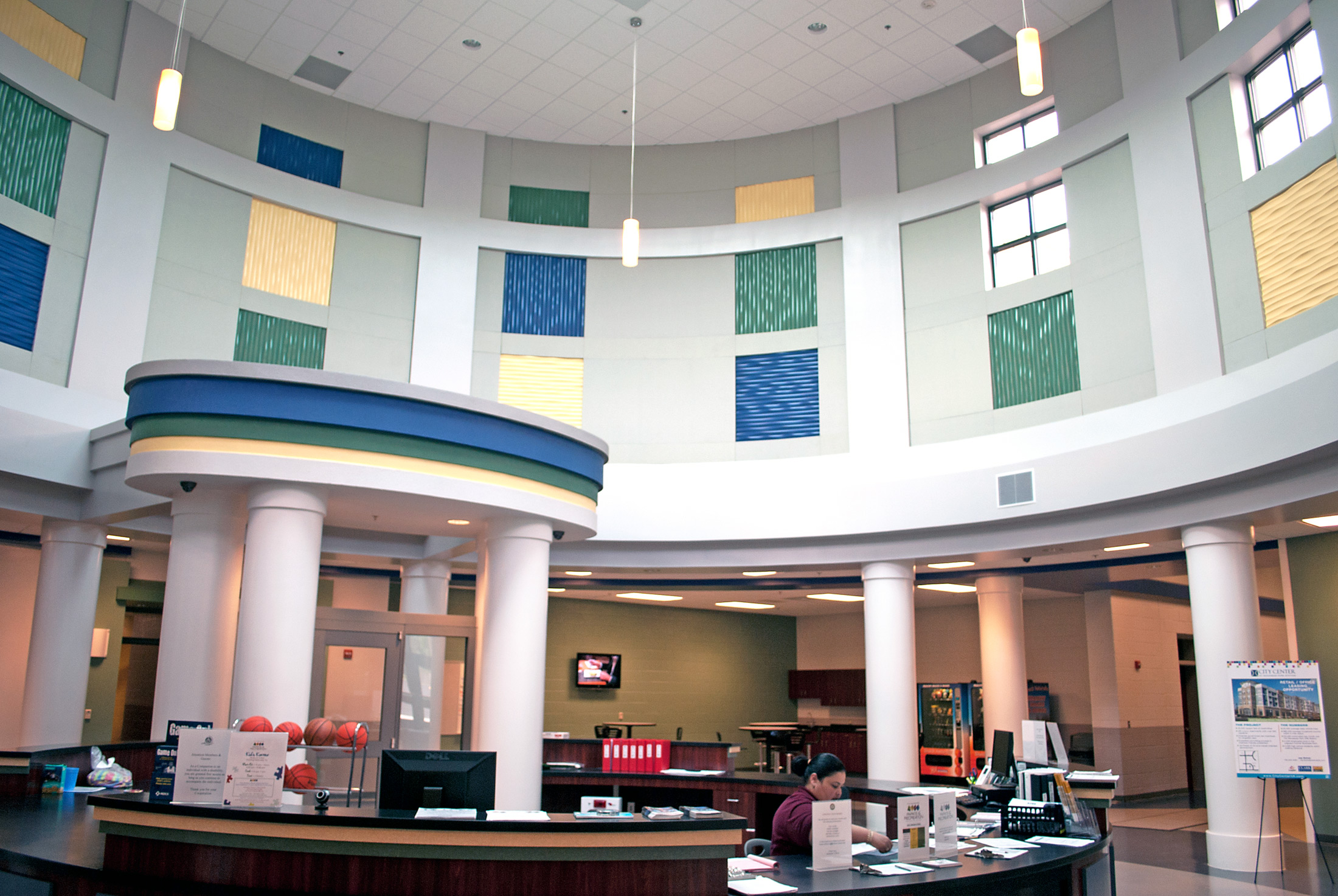 Features of this multi-generational facility include a large entry rotunda with a central control desk that provides visual control over the main corridors, two full-size basketball courts, and a twenty-five-yard eight-lane pool with zero-depth entry area featuring water jets and other play features.