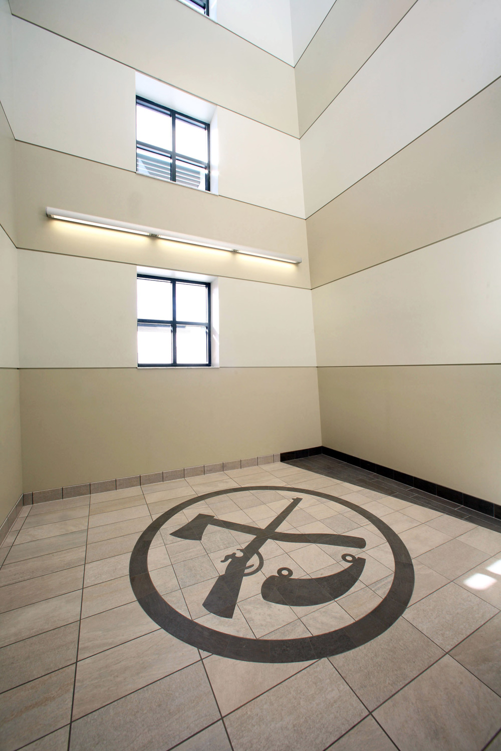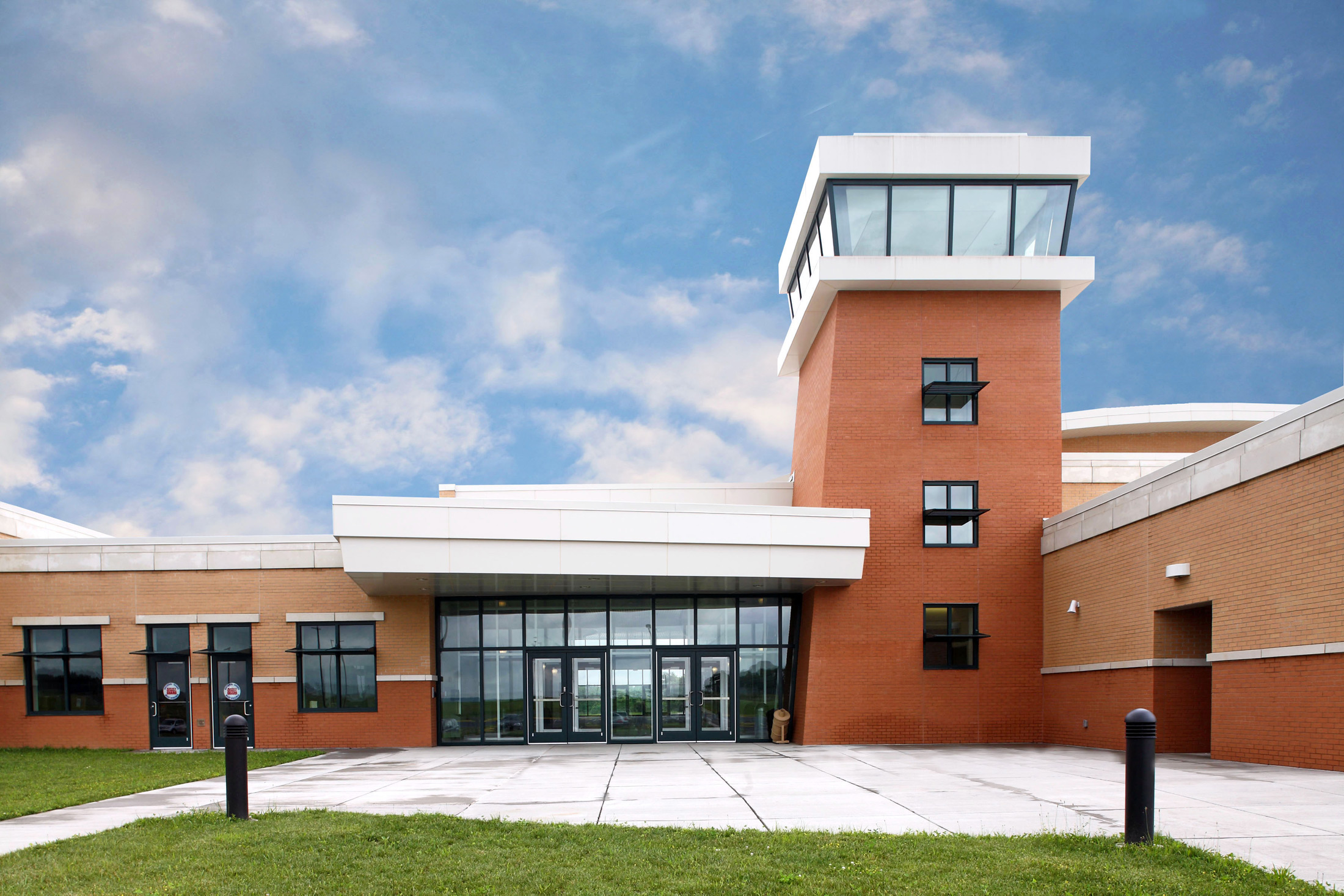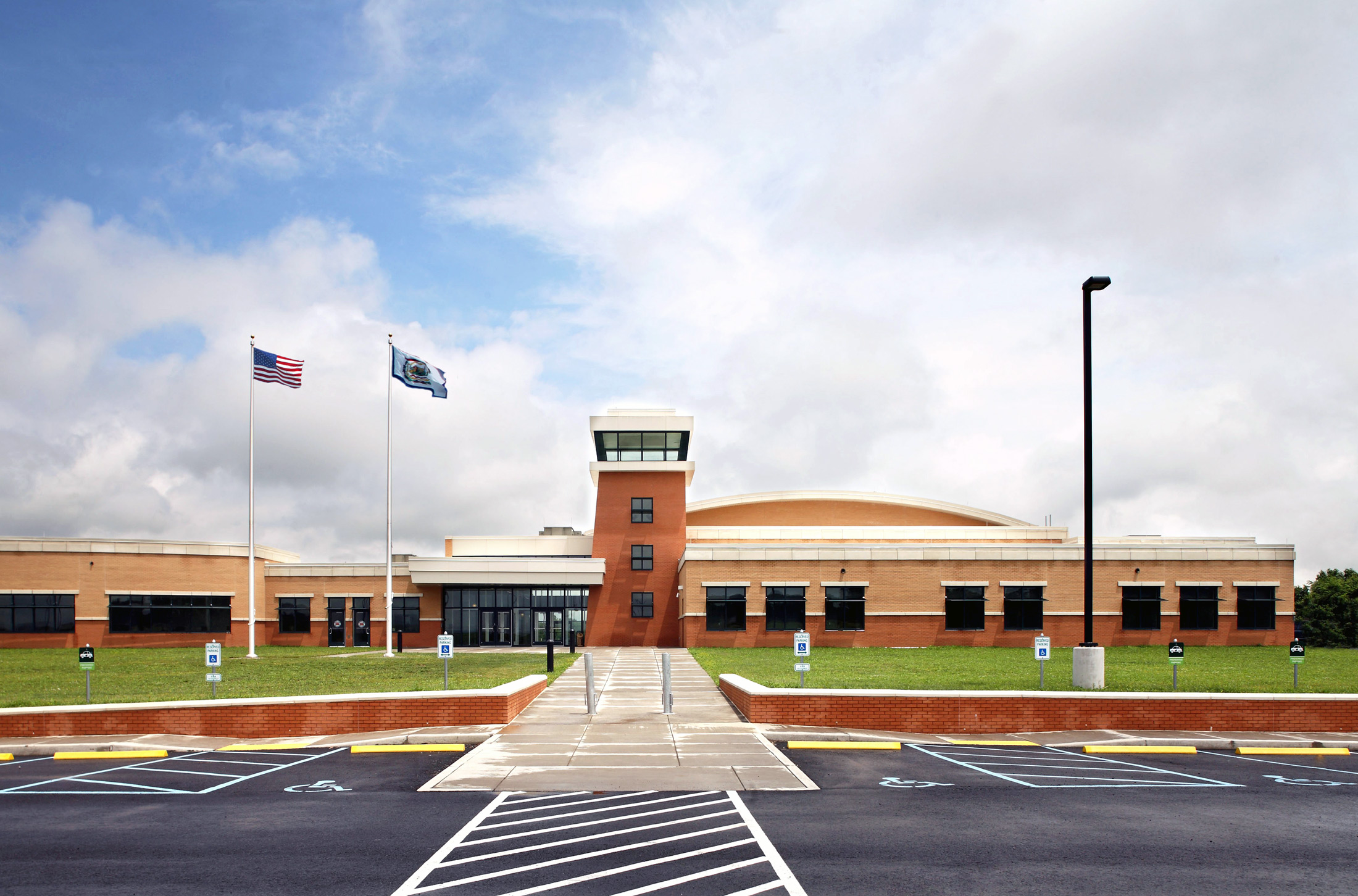 The facility is also unique due to its location on an abandoned airport runway at the Morgantown Municipal Airport. The 54,000 SF Readiness Center occupies a 35 acre tract at the airport. Additionally, the Readiness Center is located approximately 20 miles from Camp Dawson, a large state and federal training campus. As troops will often be travelling to Camp Dawson through the Morgantown Readiness Center, the facility needed to function as a “gateway.” The creation of a “gateway” facility was accomplished through exterior material choices (compatible with Camp Dawson), as well as the decision to utilize a tower-like feature to mark entry; a very prominent feature of the Regional Training Institute (RTI) at Camp Dawson. Where the RTI utilized a large cylindrical mass, the tower at the Morgantown Readiness Center respects the context of the former runway by reflecting the aesthetic of an airport control tower.