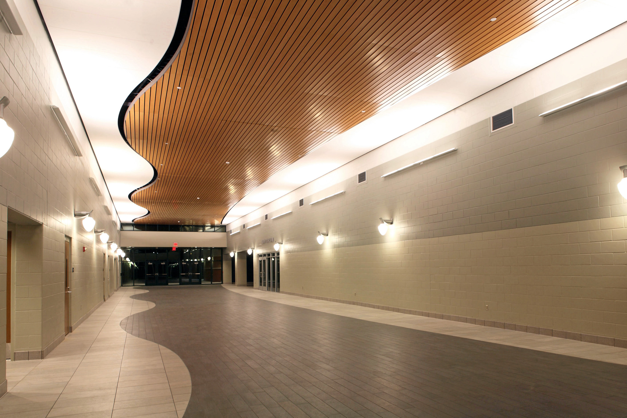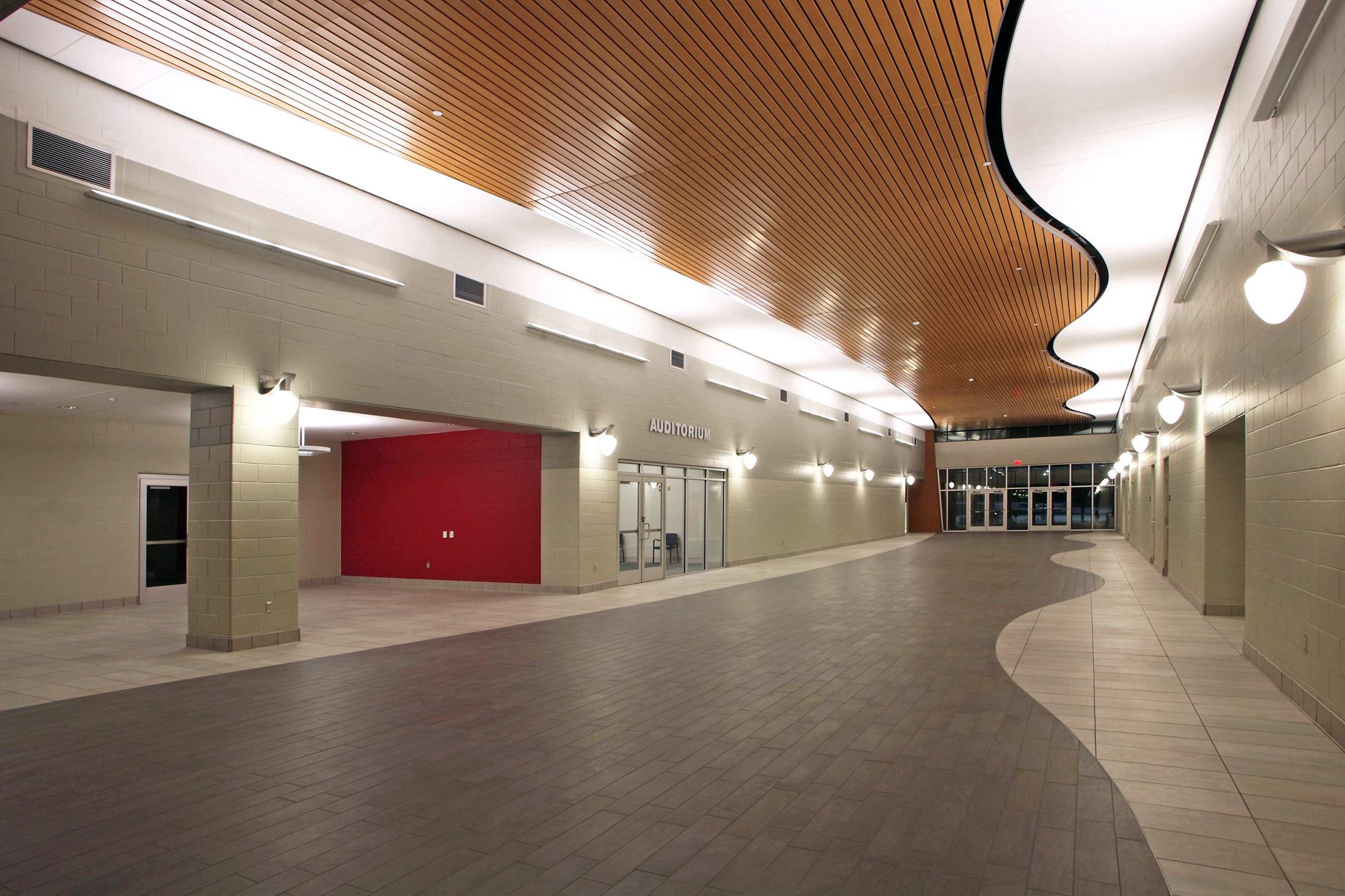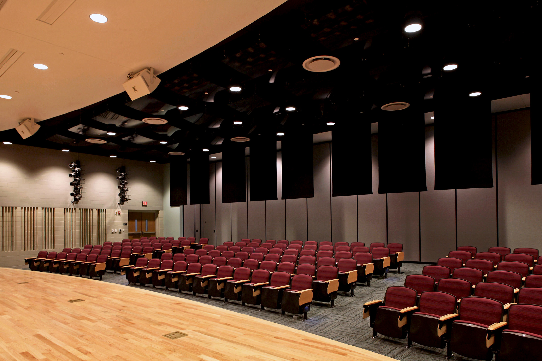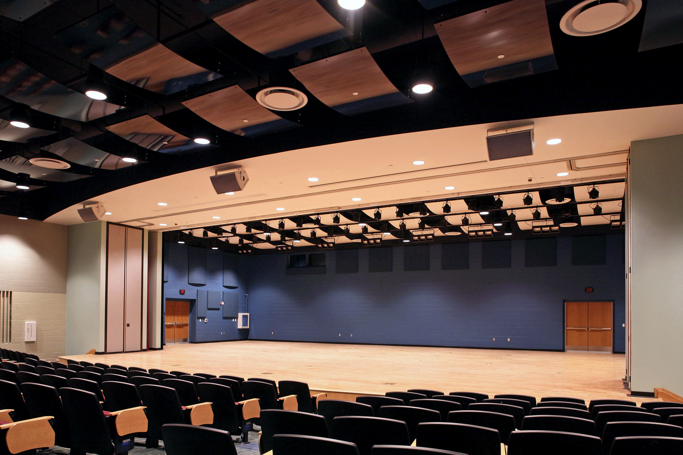 To efficiently create the stage and performance area, the design team utilized a variety of dual function spaces. The stage is actually a large rehearsal space with an adjacent elevated recording area. Two large operable partitions are used; one to separate the rehearsal area from the remainder of the stage and the auditorium, while the other separates the auditorium from the drill hall. This configuration allowed the design team to maximize the West Virginia Army National Guard’s investment by utilizing federally authorized space to also function as a large performance area. Acoustically, this challenge was met by creating a drill hall with an irregular shape that was contained within a rectilinear, sloped barrel arch form. The geometry was complimented by acoustically-engineered interior surfaces and finishes to create a vibrant and rich auditorium.