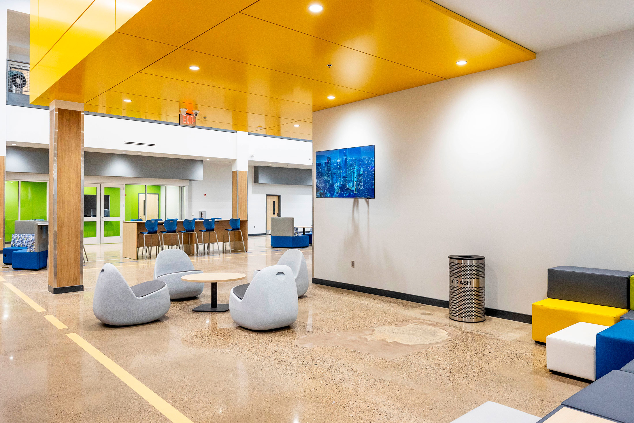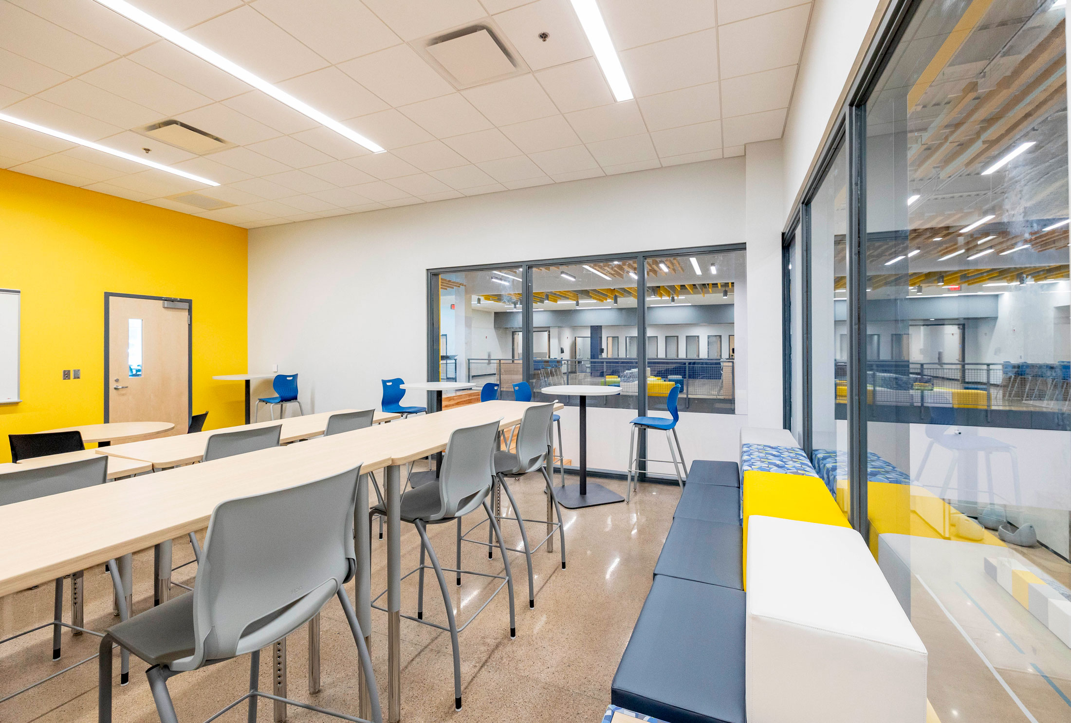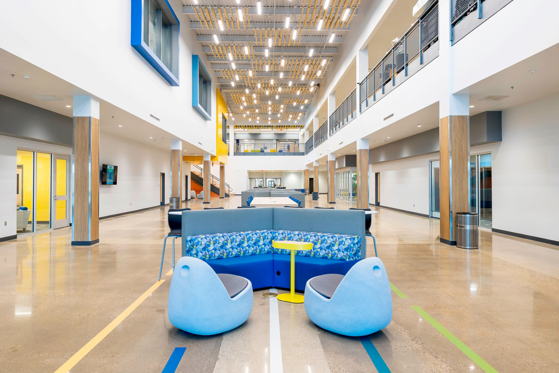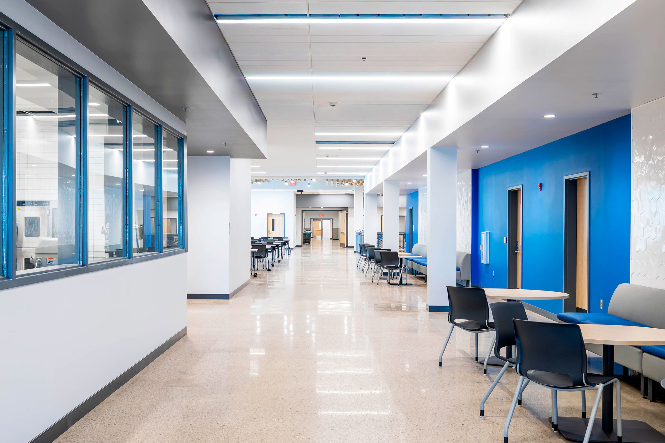 The existing painted masonry façade is clad in multicolored metal panels and horizontal windows. The existing main entrances were removed and reimagined with a glass façade that stretches into the existing building, creating an atrium that terminates at a lecture stair adjacent to the second-floor dining room. The two-story atrium is the focal point of the interior space, highlighting the classrooms that overlook the entrance corridor. All classrooms and lab areas have a glass entrance to showcase the technology and career learning that goes on inside the space.
