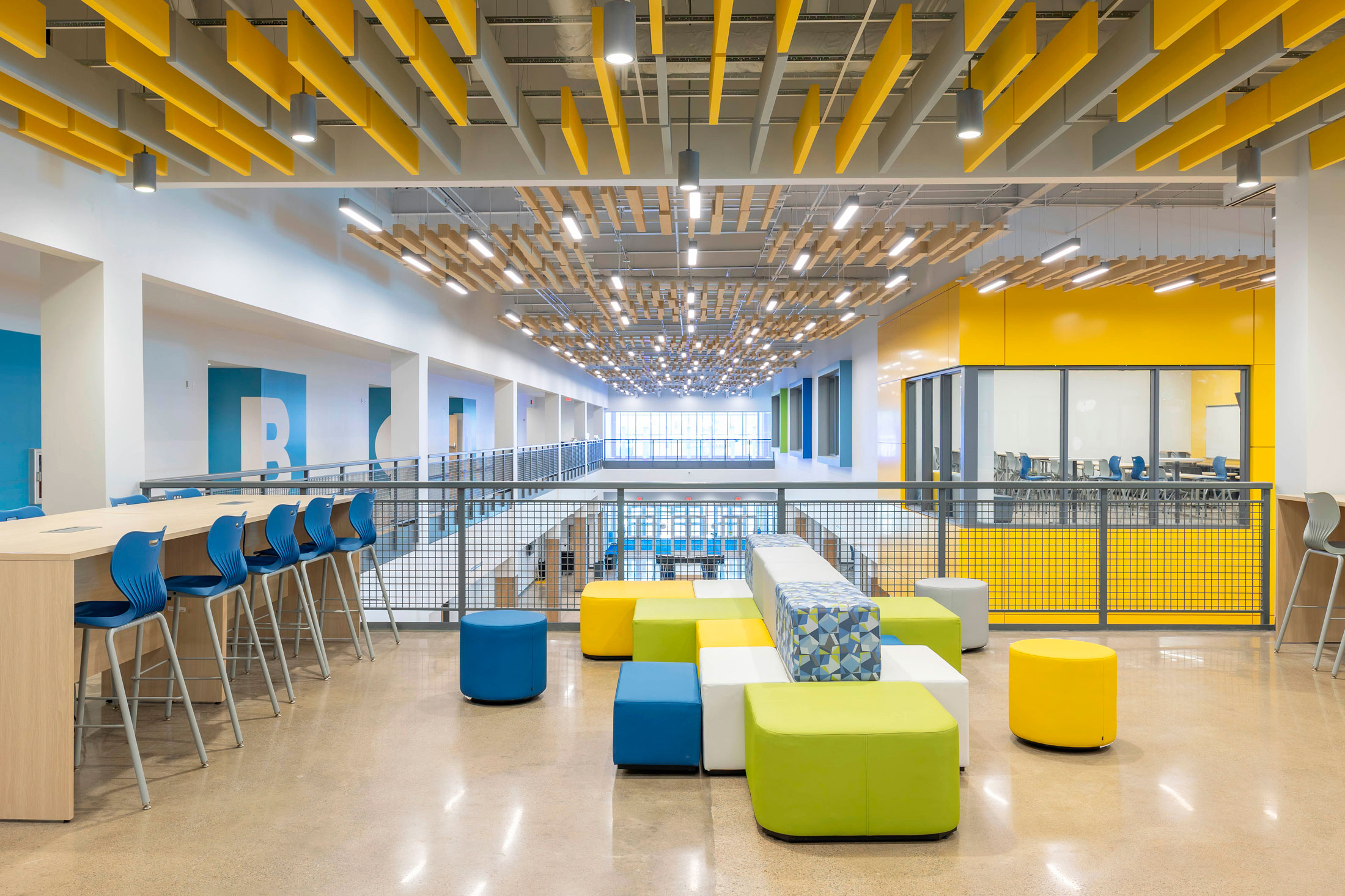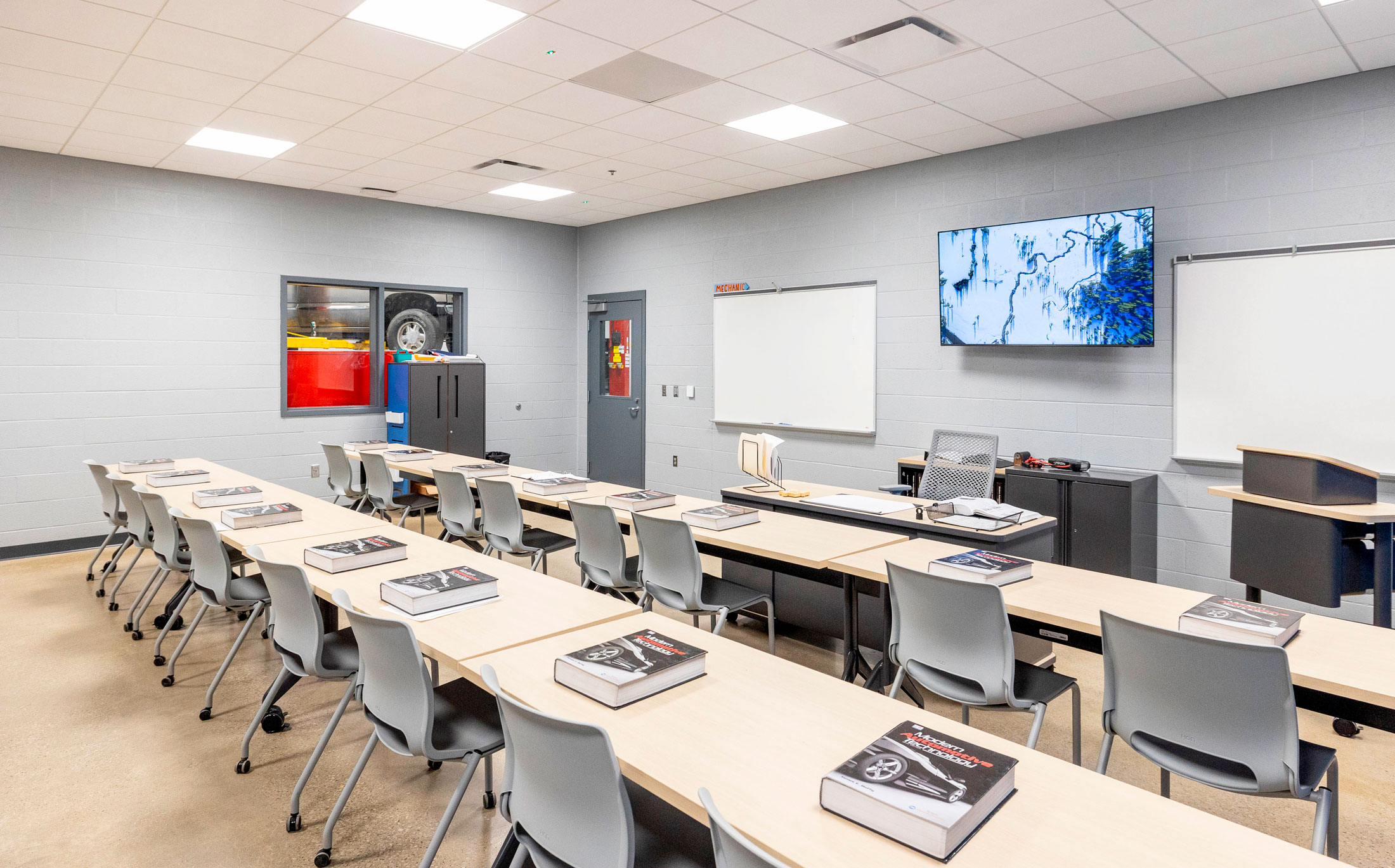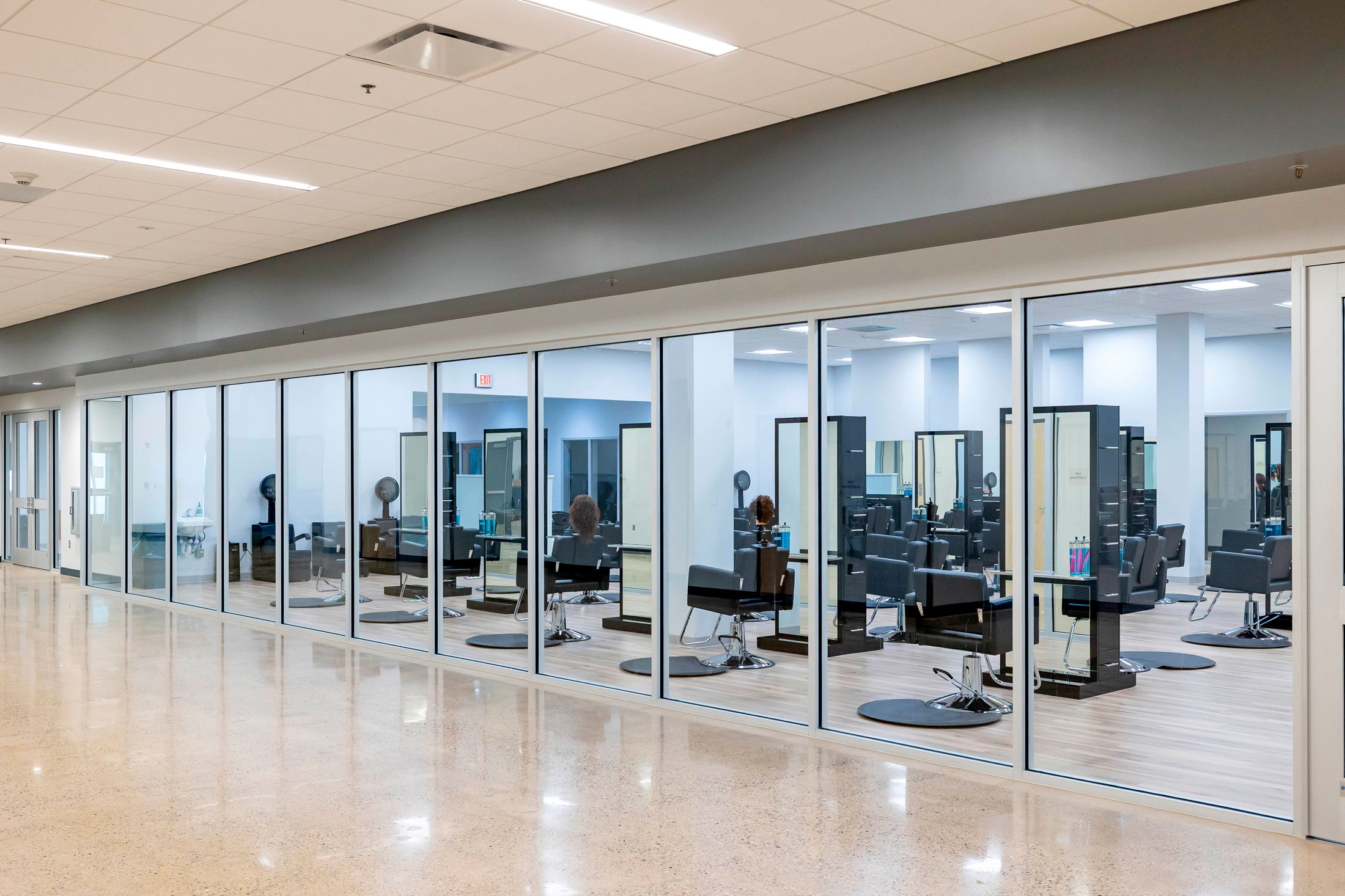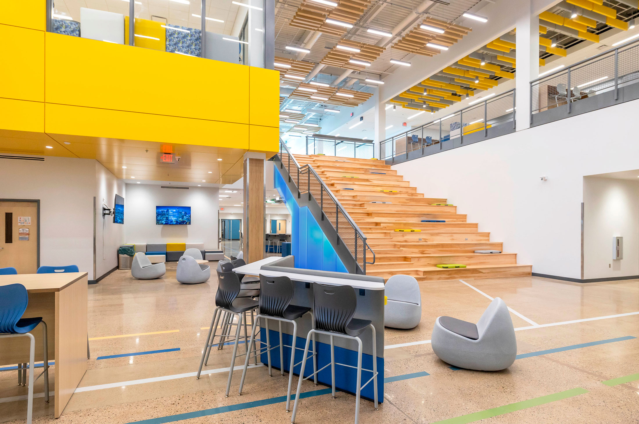 The existing painted masonry façade is clad in multicolored metal panels and horizontal windows. The existing main entrances were removed and reimagined with a glass façade that stretches into the existing building, creating an atrium that terminates at a lecture stair adjacent to the second-floor dining room. The two-story atrium is the focal point of the interior space, highlighting the classrooms that overlook the entrance corridor. All classrooms and lab areas have a glass entrance to showcase the technology and career learning that goes on inside the space.