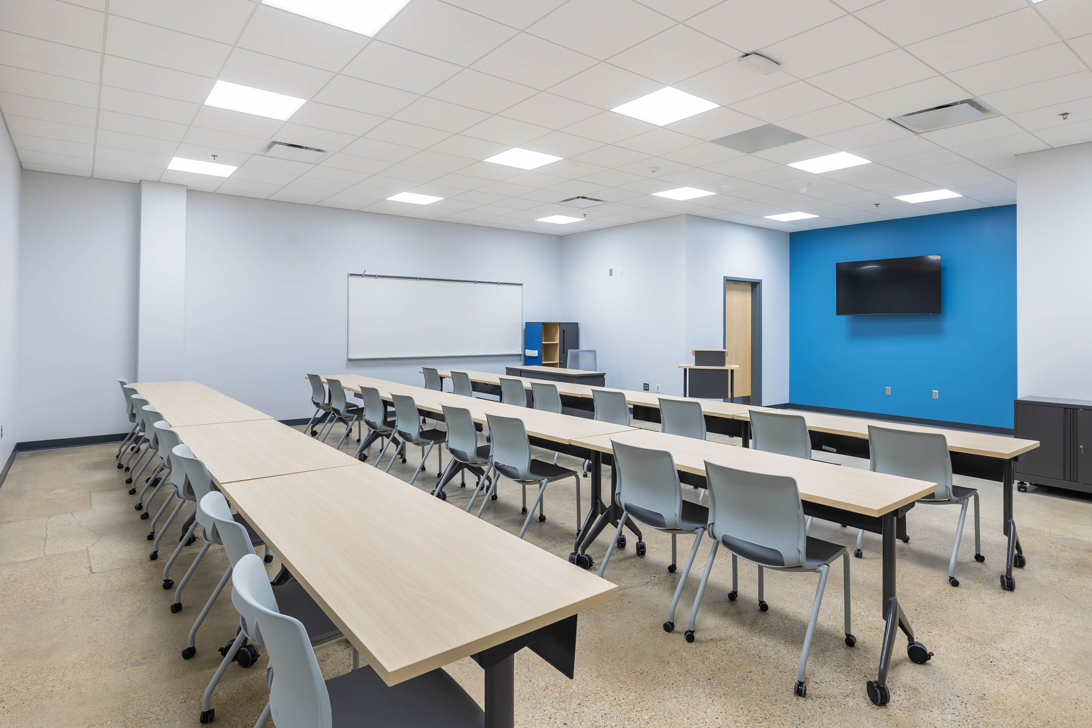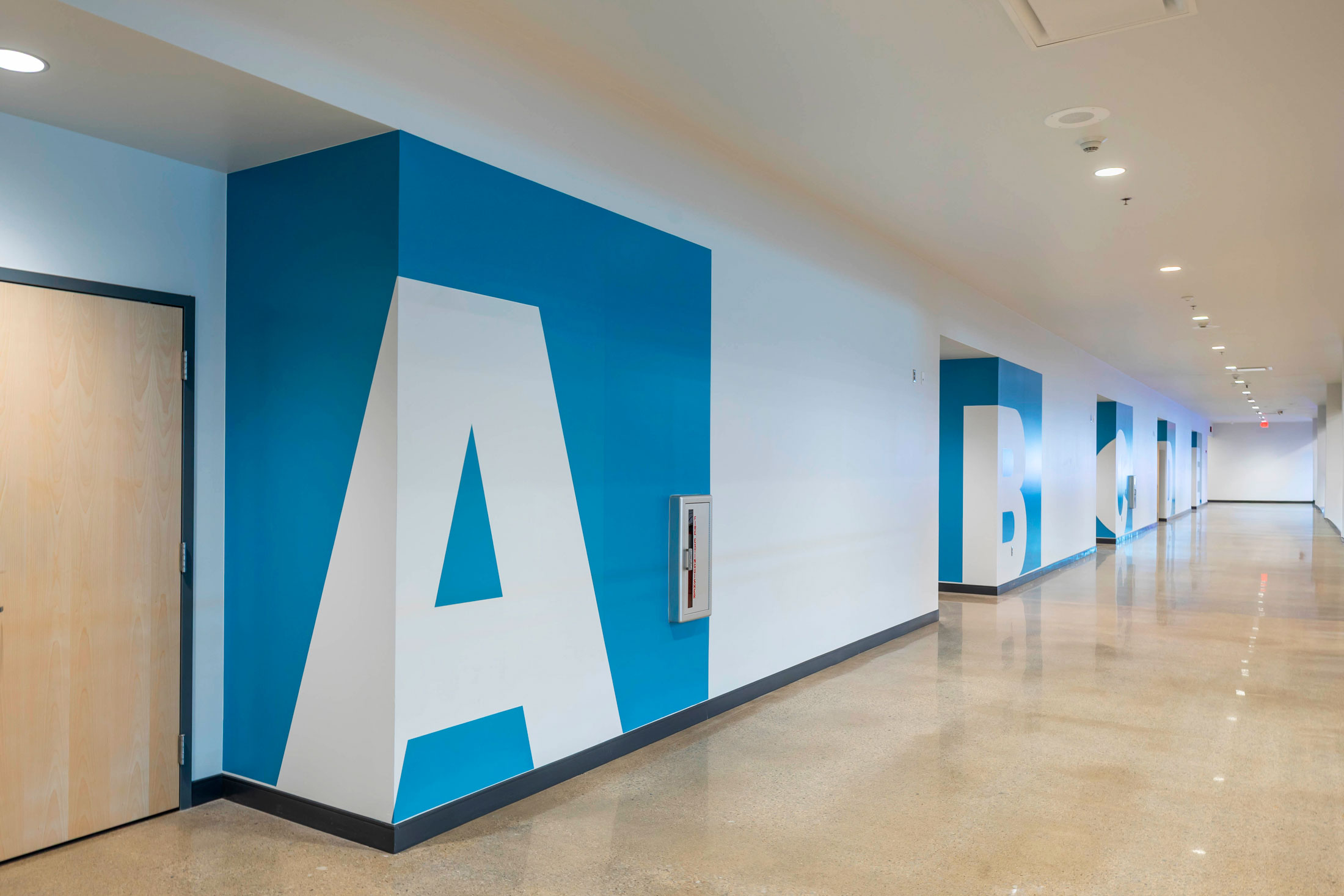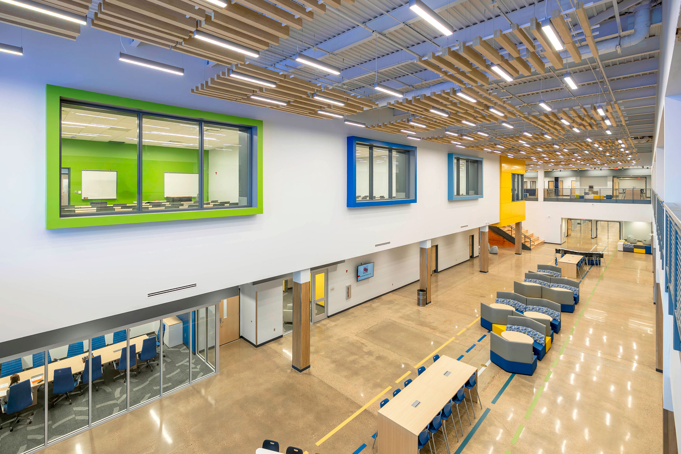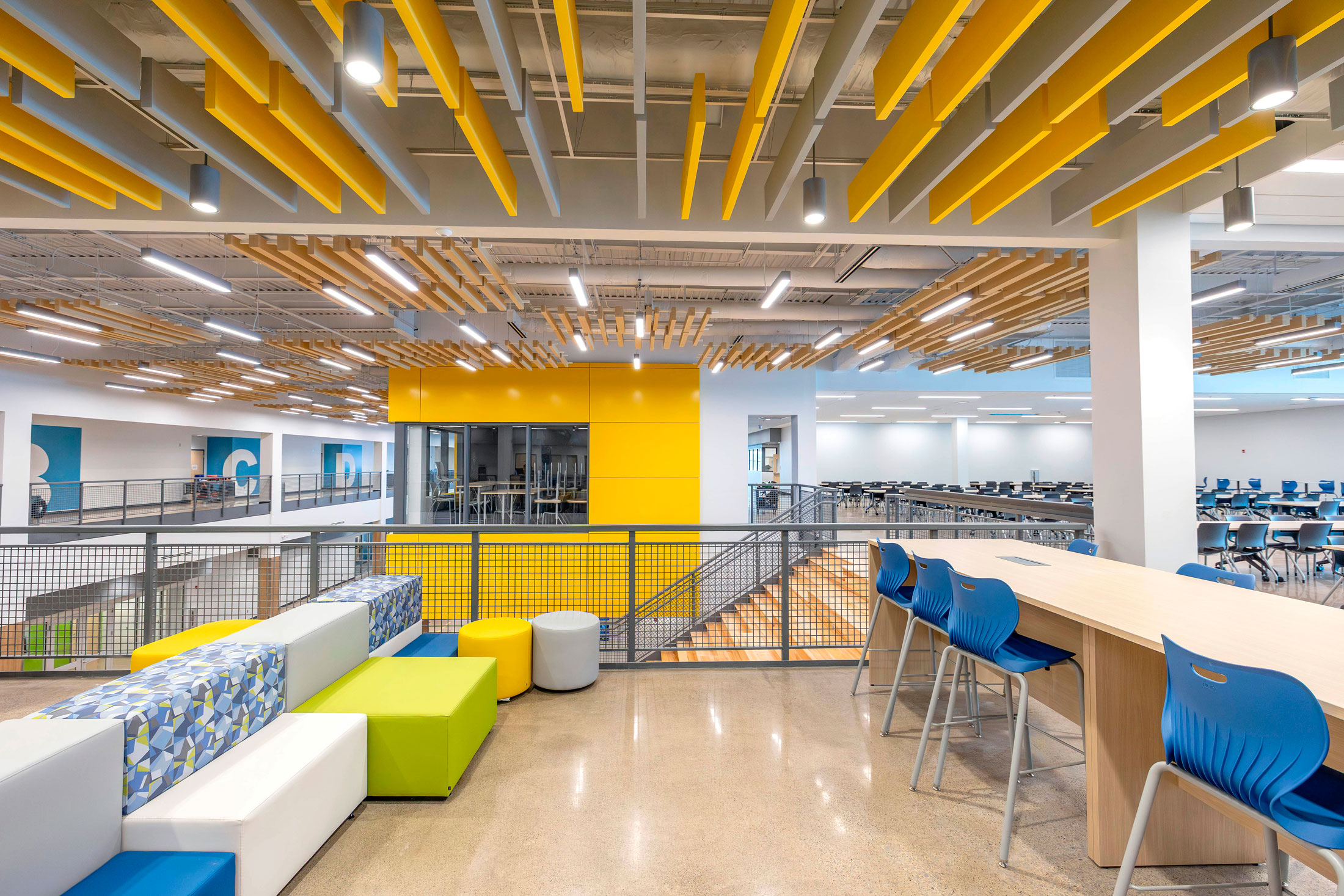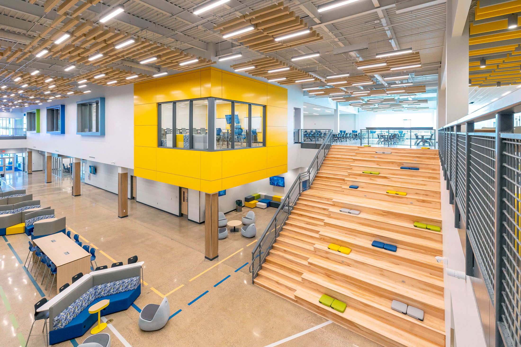 The existing painted masonry façade is clad in multicolored metal panels and horizontal windows. The existing main entrances were removed and reimagined with a glass façade that stretches into the existing building, creating an atrium that terminates at a lecture stair adjacent to the second-floor dining room. The two-story atrium is the focal point of the interior space, highlighting the classrooms that overlook the entrance corridor. All classrooms and lab areas have a glass entrance to showcase the technology and career learning that goes on inside the space.