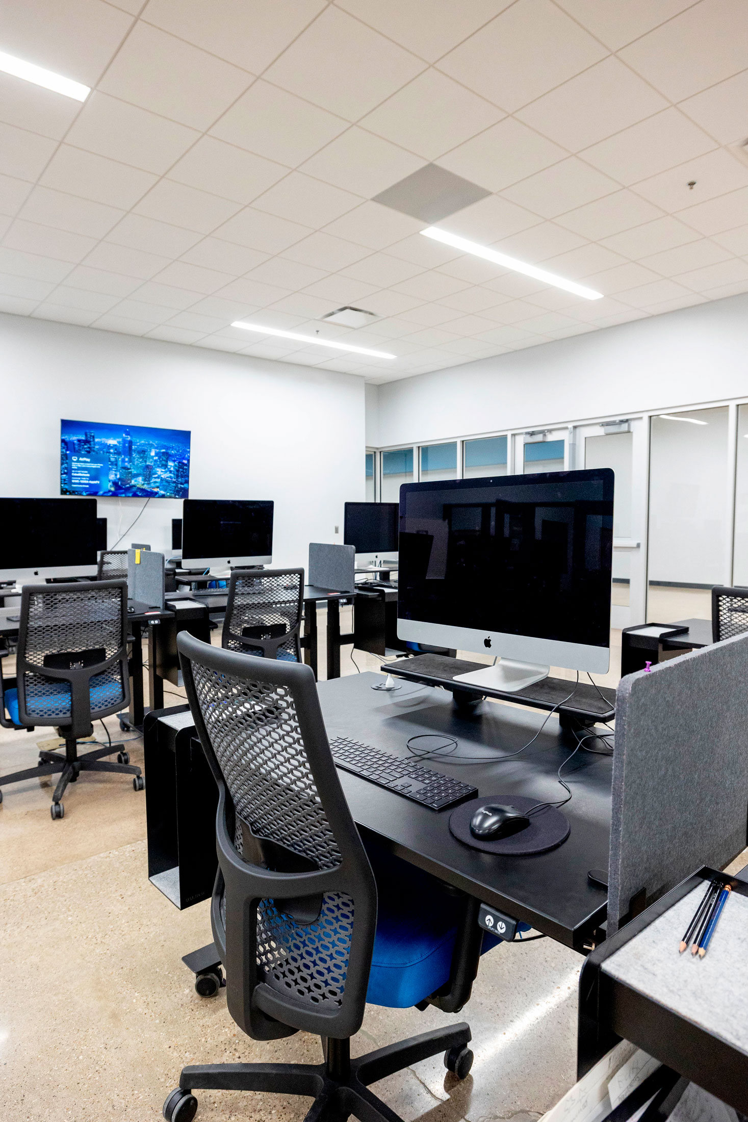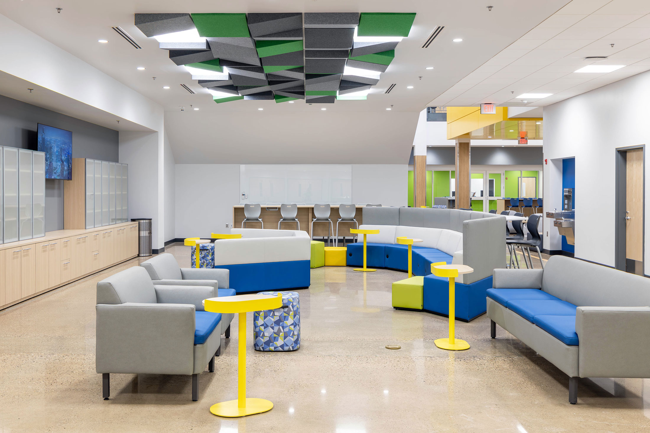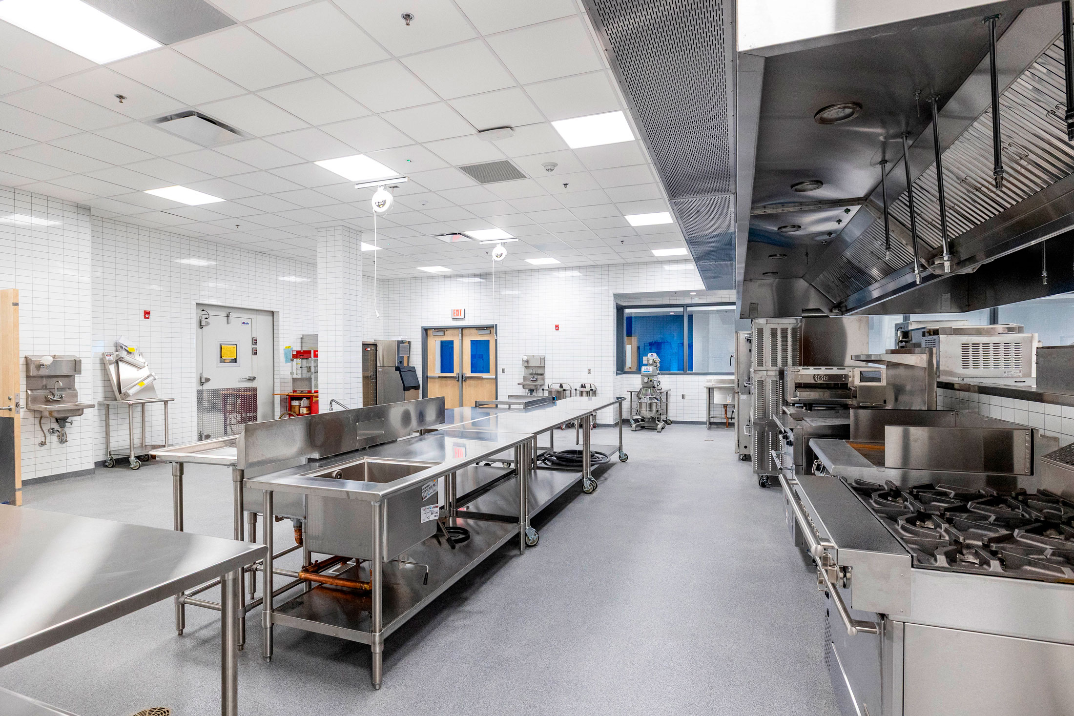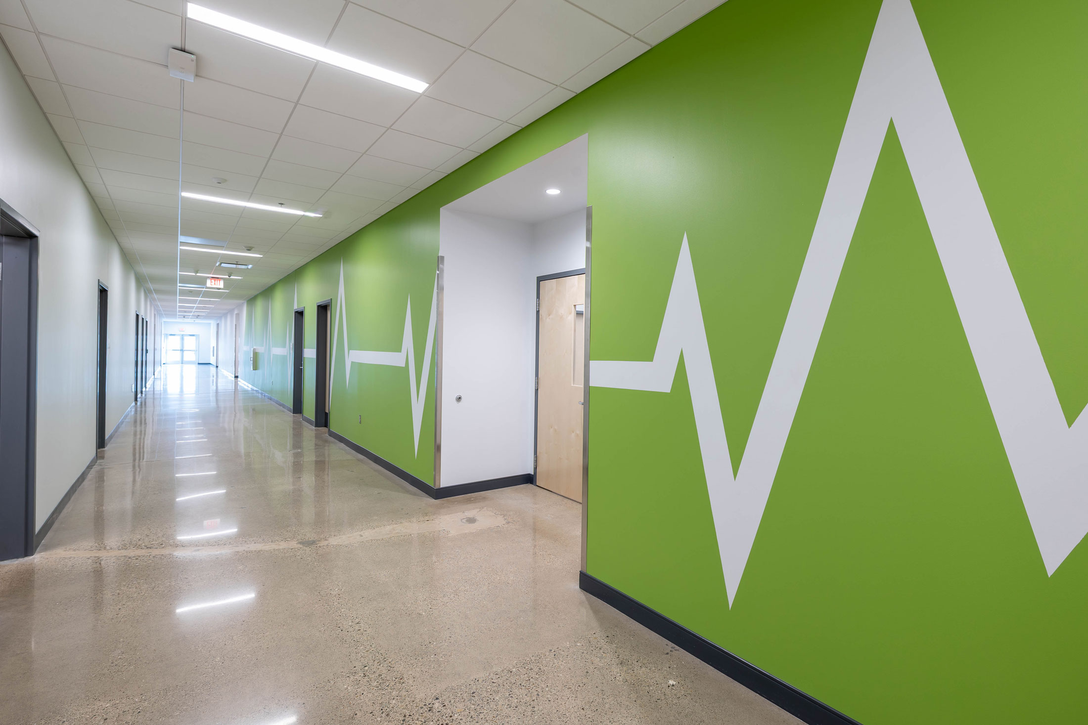 The existing painted masonry façade is clad in multicolored metal panels and horizontal windows. The existing main entrances were removed and reimagined with a glass façade that stretches into the existing building, creating an atrium that terminates at a lecture stair adjacent to the second-floor dining room. The two-story atrium is the focal point of the interior space, highlighting the classrooms that overlook the entrance corridor. All classrooms and lab areas have a glass entrance to showcase the technology and career learning that goes on inside the space.