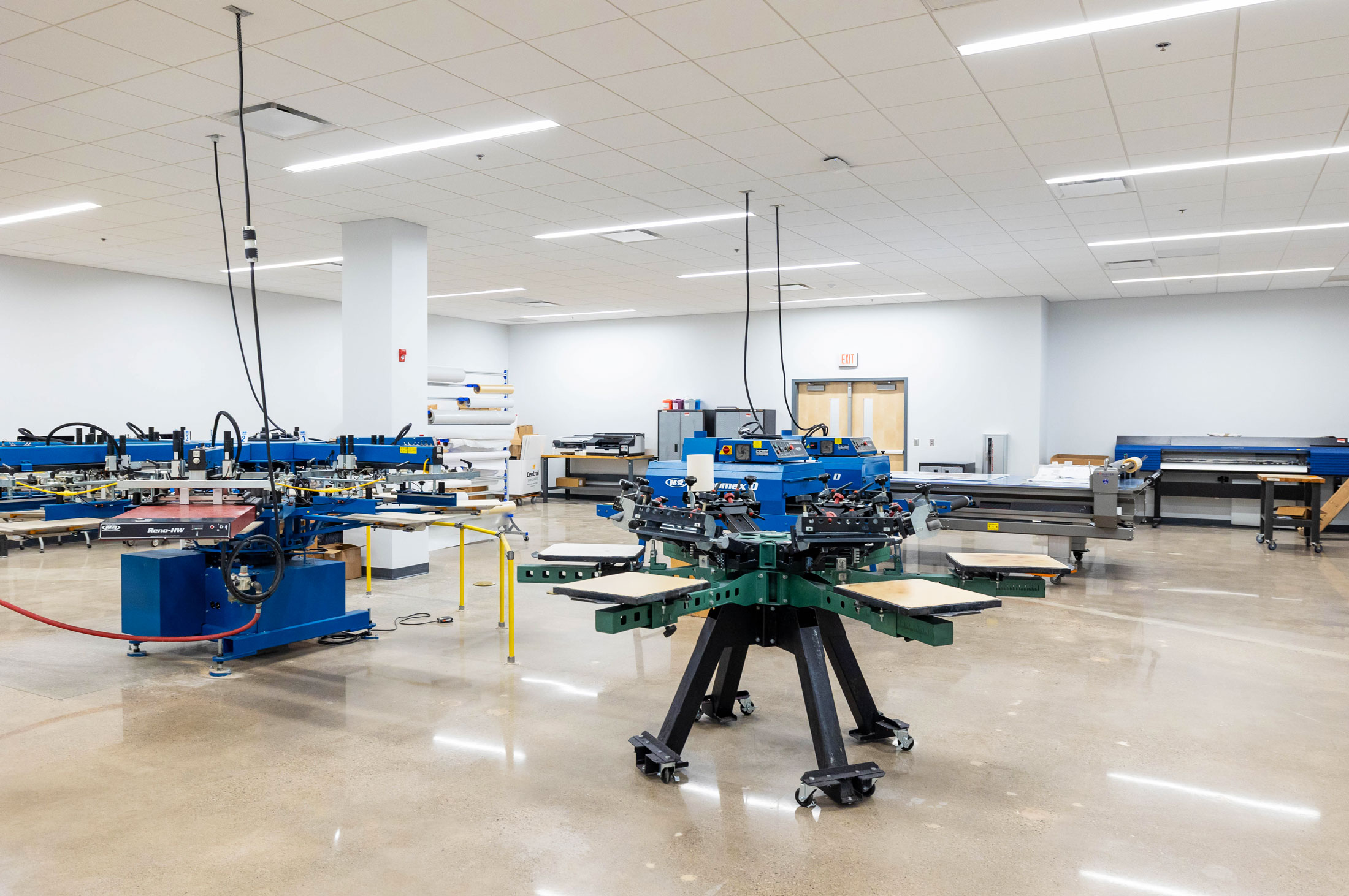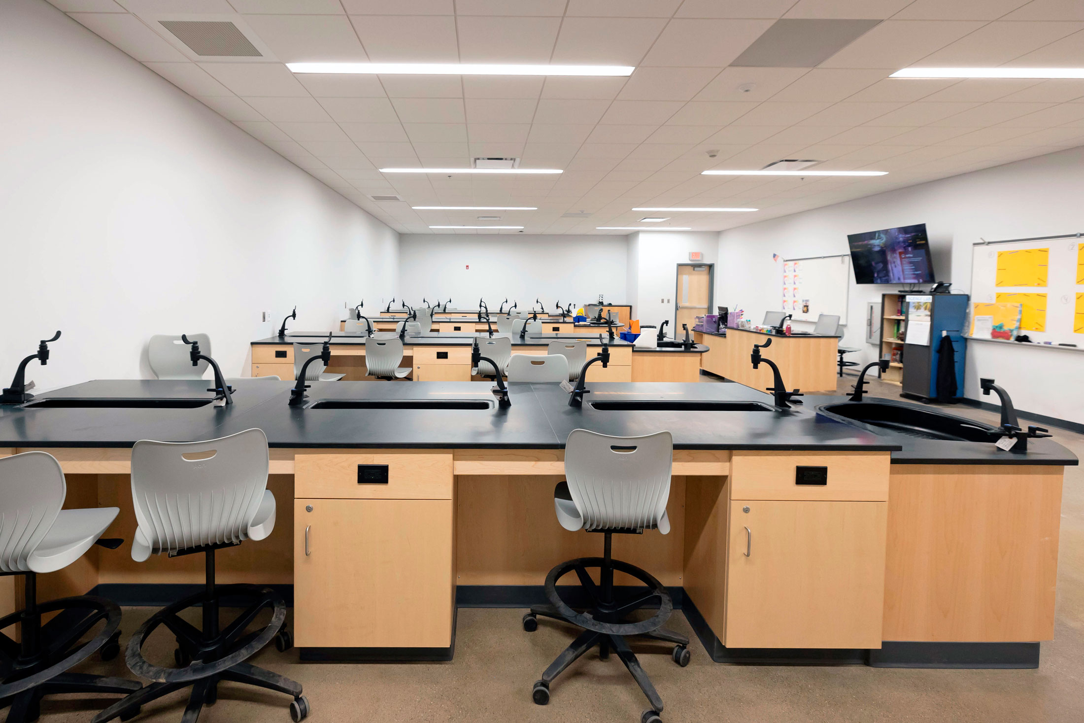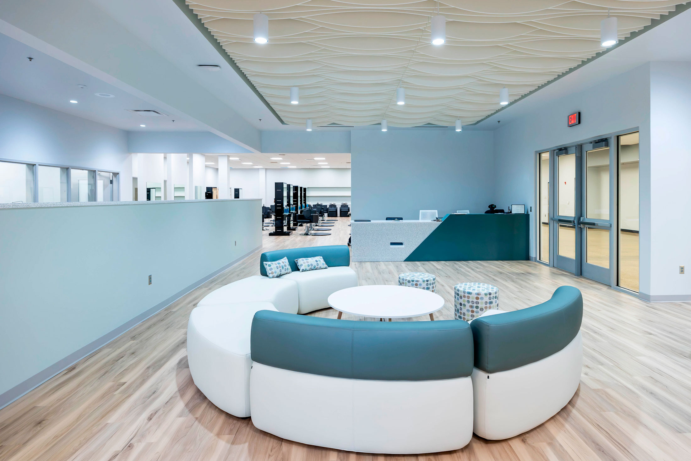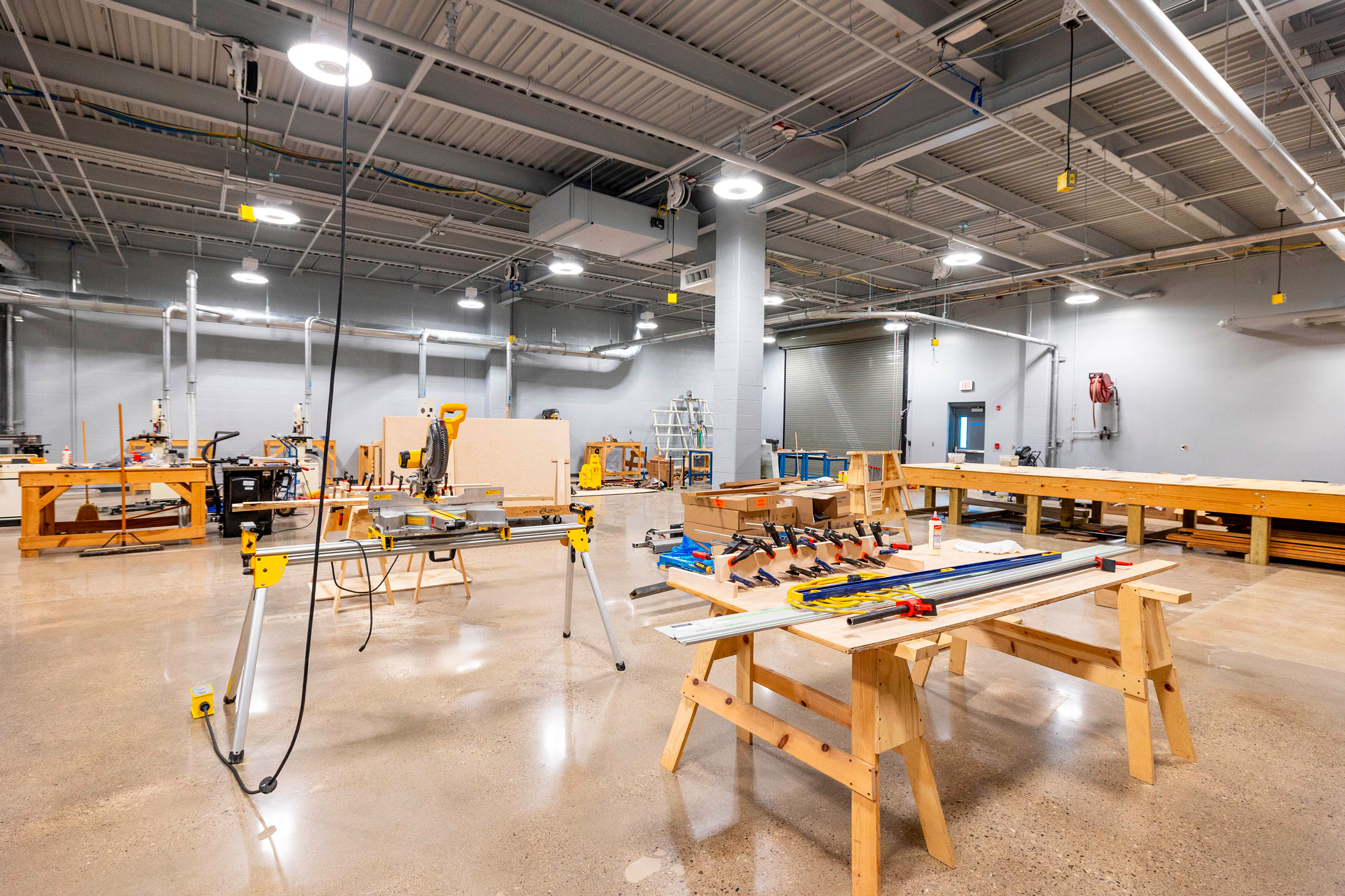 The existing painted masonry façade is clad in multicolored metal panels and horizontal windows. The existing main entrances were removed and reimagined with a glass façade that stretches into the existing building, creating an atrium that terminates at a lecture stair adjacent to the second-floor dining room. The two-story atrium is the focal point of the interior space, highlighting the classrooms that overlook the entrance corridor. All classrooms and lab areas have a glass entrance to showcase the technology and career learning that goes on inside the space.
